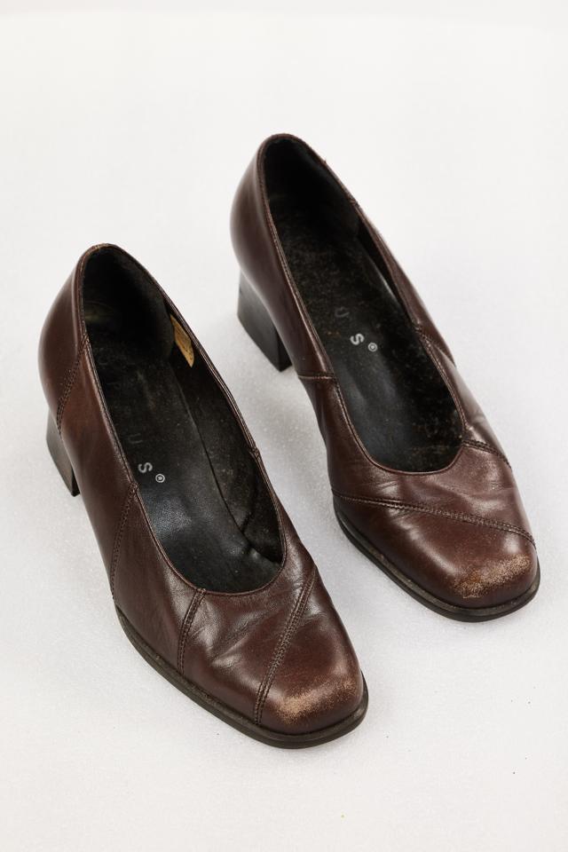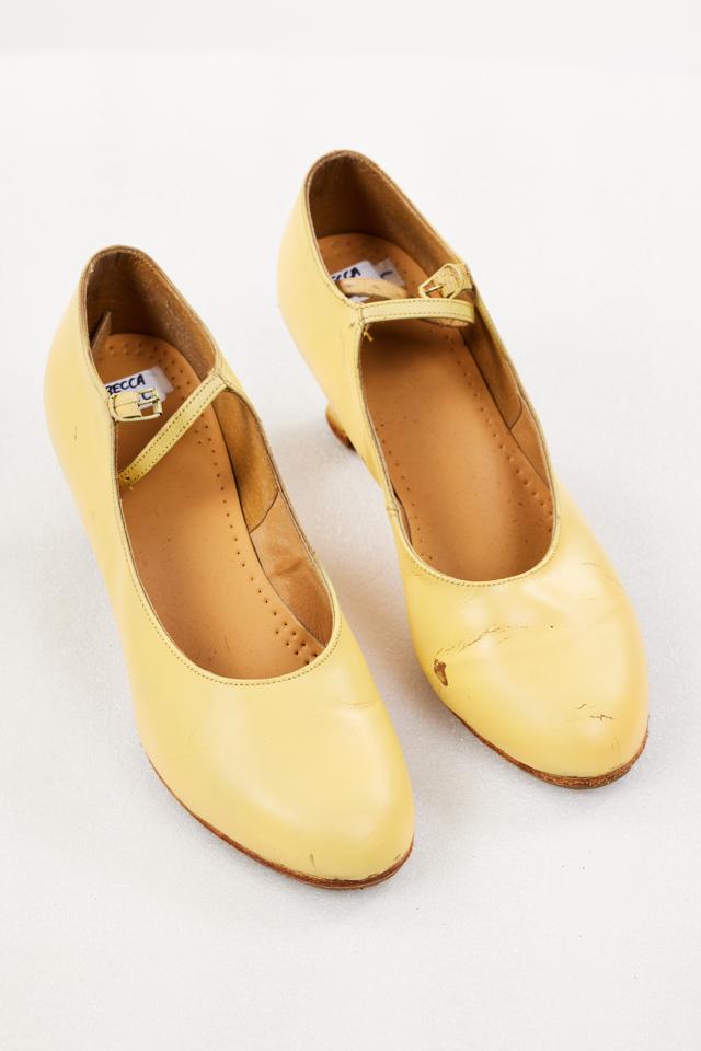 Women's yellow character shoes. Small heel. Ankle strap and buckle fastening. UK size?