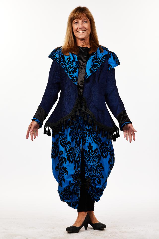 Men's Tudor/Elizabethan style costume includes pantaloons, jacket, ruff and hat. Colours black, white, blue