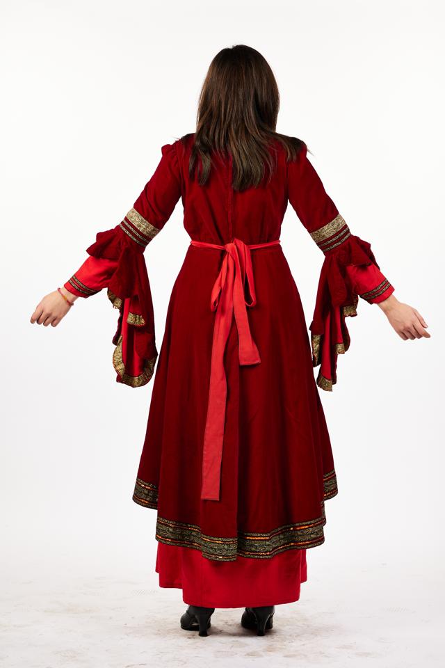 This rich red medieval style dress comprises of a red velvet long sleeved bodice with gold trim at the front. The sleeves drape down from the elbow and have a complementary bright red sleeve underneath that cuffs at the wrist with gold trim. The skirt of the dress is scalloped so that the front sits higher than the back. The skirt has a calf length under dress of brighter red fabric. The dress has a slim belted bright red sash that drapes at the front and ties in a bow at the back. Suitable for pantomimes such as King Arthur, Rapunzel, Sleeping Beauty, Robin Hood and more. Dress size 12-14. Boots not included.