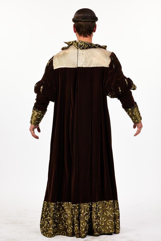 Men's long robe/tunic in rich brown velvet has a ruffed collar in green shiny fabric and leg of mutton split sleeves. The robe/tunic is complimented with a metallic gold quilted square panel across the chest and shoulders. The base of the robe/tunic and cuffs on the sleeves are highlighted with complimentary green and gold brocade fabric. The whole look is finished off with a brown faux leather hat with dark green trim. Easy zip fastening at the back. Suitable for a pantomime villain or villager.