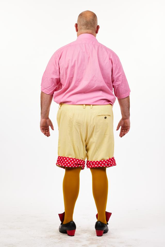 Arthur the Postman costume comprises of a pink short sleeved shirt with single breast pocket. A pair of yellow shorts trimmed with red and white polka dot fabric on the hem of the shorts. This costume was designed for and featured in a production of Dick Whittington (Panto) Shirt size, 47" chest. Waist size 40" on shorts. Tights and shoes not included. *Post-worker bag is also available to hire separately.