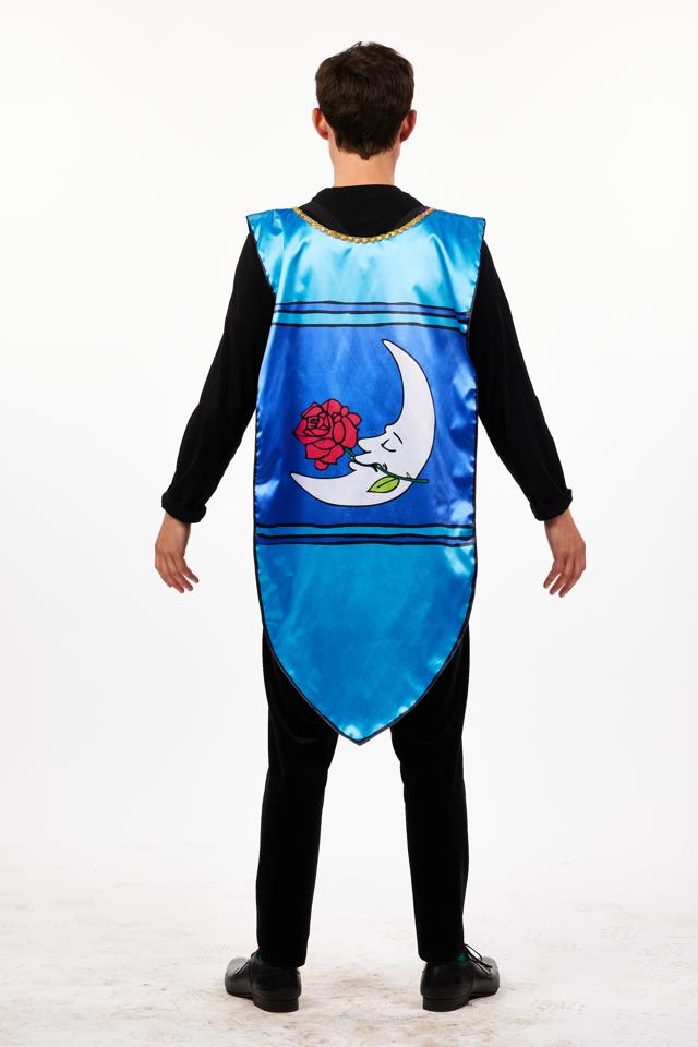 This blue tabard can be worn over stage blacks.The tabard is made from dark and light blue faux silk fabric and has a sleeping crescent moon motif with a red rose in its mouth, on both the front and back. The tabard has a single scallop hem and sits at the knee at its longest point. It has a crew neckline with gold bric-a-brac trim. The tabard is worn over the head, great for quick changes and suitable for a pantomime chorus member or ensemble character. One size. Stage blacks not included