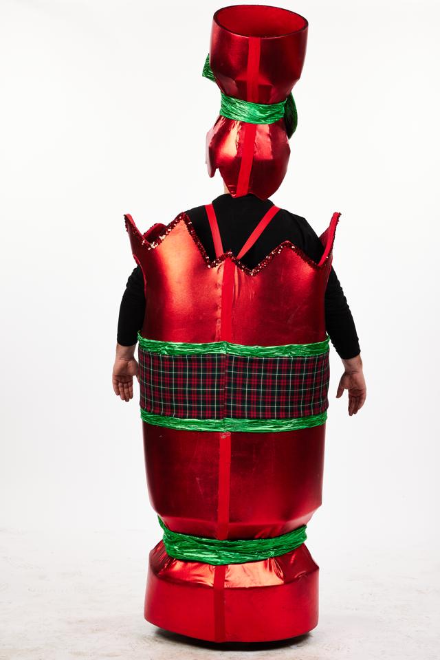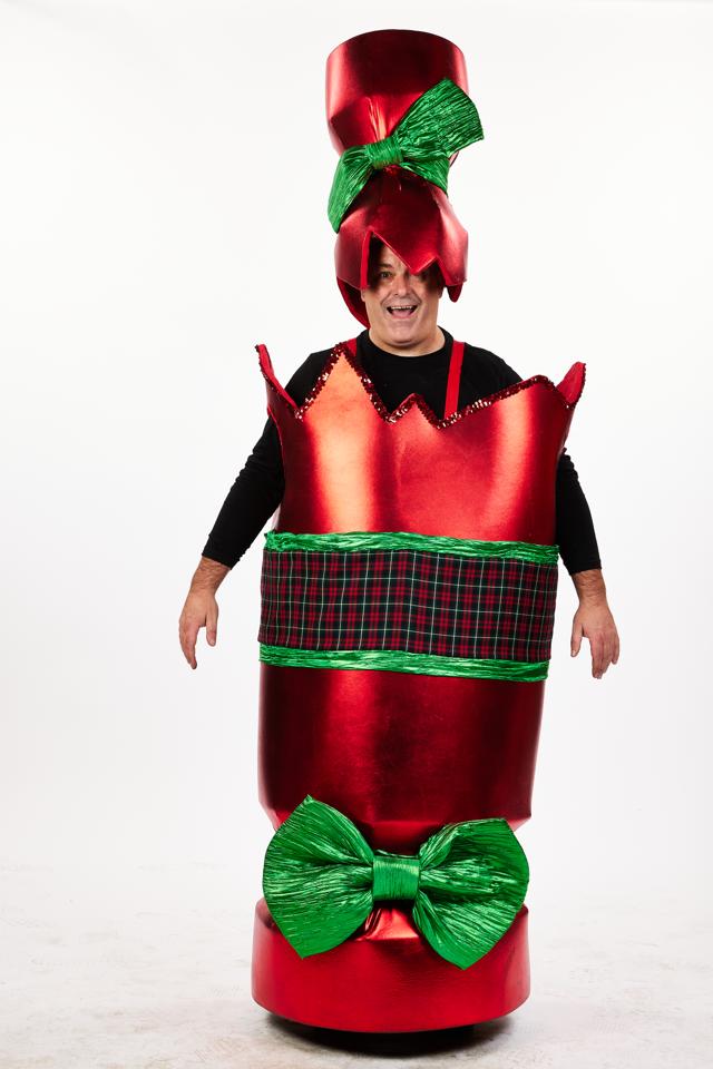 This cracking costume is sure to make any party or pantomime pop! The mascot costume is constructed of light weight foam covered in rich red, shiny metallic fabric. The cracker is decorated with a band of red paid fabric edged in bright green shiny metallic fabric. A large bright green shiny metallic bow decorates the bottom end of the cracker costume. The costume is put on over the head. There is an opening at the bottom of the cracker for the wearer's feet, allowing them to walk. The costume is designed to look as if it has been pulled apart and the top half of the wearer is seen to be popping out of the torn end. The costume is supported by the wearer with a set of red shoulder straps which enables the costume to be easily moved about. An outrageous hat forms the torn off opposite end of the cracker. This surprising costume will definitely make any pantomime finale go with a bang! Black shirt not included. Universal Size, U.