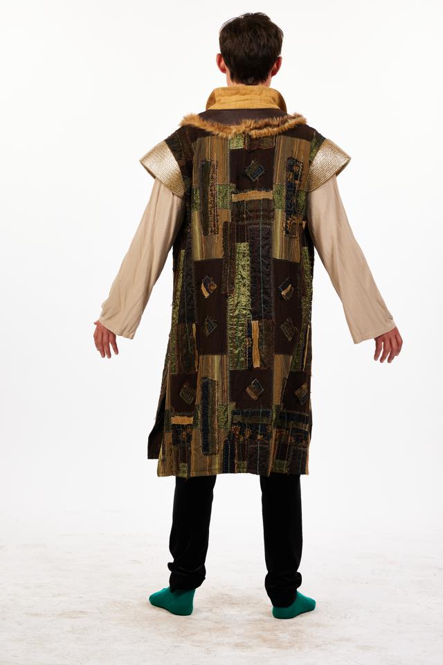 This medieval style tunic is made of rich patchwork patterned jacquard fabric in browns, greens and gold. It has brown faux leather V shaped neckline which is edged in beige faux fur trim. The neck is accentuated with a stand up beige cotton collar. The sleeve openings have metallic gold fabric caps. A biscuit coloured rustic shirt is worn underneath (included in hire). Perfect for one of Robin Hood's band of merry men, villager or henchman. Black trousers and shoes not included.