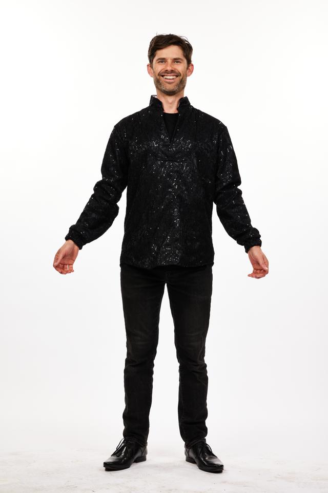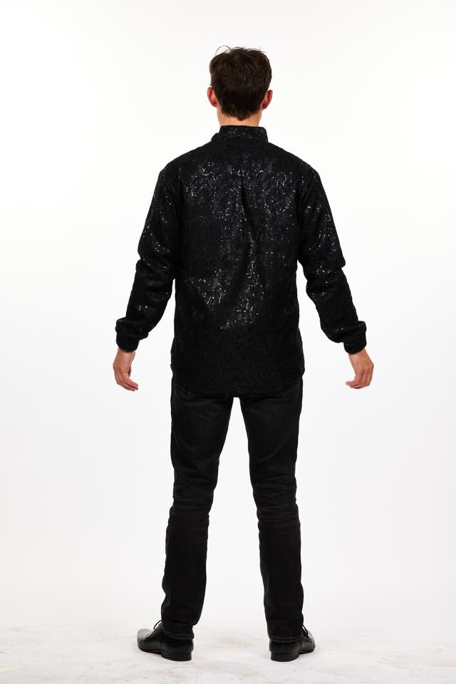 Simple men's sparkly, black sequin shirt with high mandarin collar. Black chord ties at neckline. Size 40" chest M-L, Medium-Large.