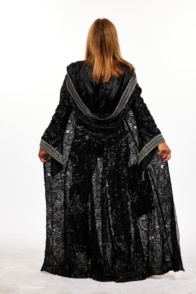 This darkly delicious cloak is perfect for any witch or evil queen who's out and about making mischief. A generous cloak with plenty of movement and oversized hood. The sheer embossed black net fabric with silver and black brocade trim on sleeves and around the edge of the hood make this very much a statement piece that looks incredible over another costume in contrasting colours.