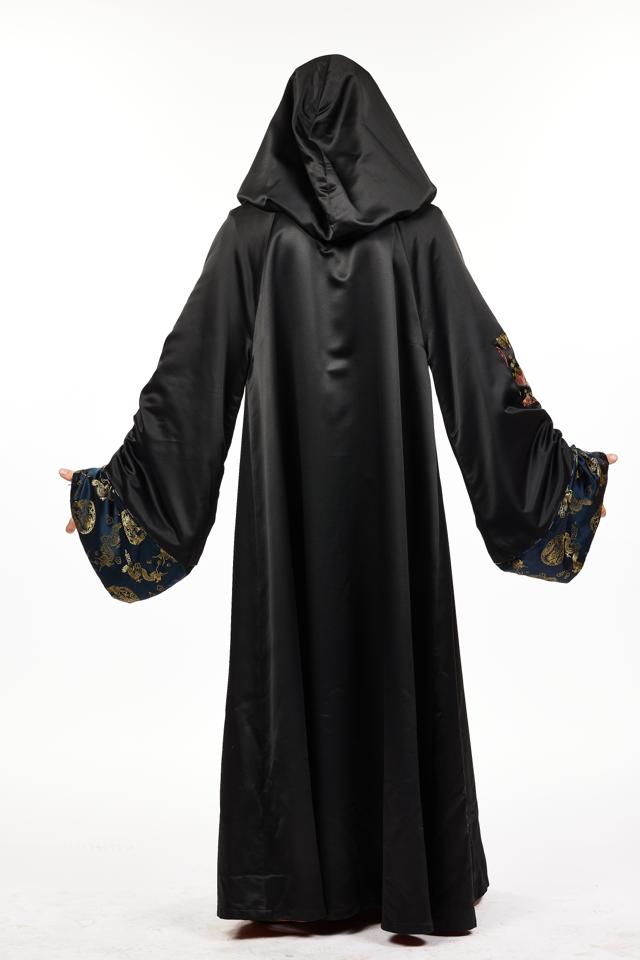 Floor length black silk cloak with hood. Chinoiserie floral design silk fabric on cuffs and in the lining of the hood. Front fastening.
