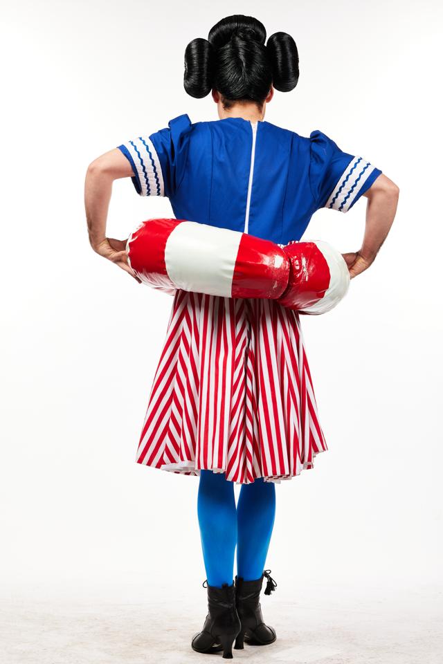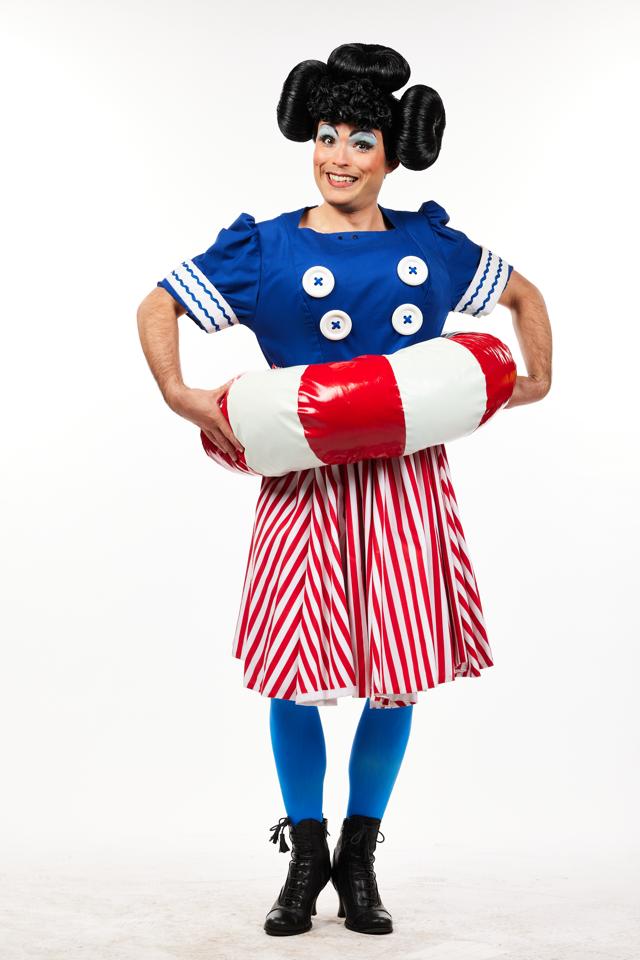 All abord! This fun dame dress is the perfect thing for ship life. Comprised of a blue bodice with Square cut neck and white nautical piping at the cuffs leading down to a red and white striped knee length skirt. Also included is a bathing bell life preserver made from foam and vinyl fabric, this is fastened by poppers that split the preserver and negate the need to put it over the dames head or have to wriggle up into it. The life preserver IS NOT to be used as a floatation device. Wig, Boots and tights not included in this hire. S-M, Small-Medium.