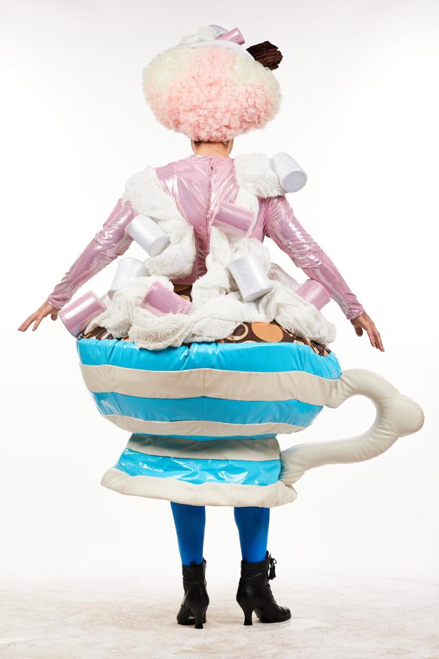 Do you want that with Marshmallows? The perfect dress for a dame who is about st spill the tea (well chocolate) with the girls for wants a winter warmer to go. The cup dress is foam with vinyl covering in blue and white the body is covered with a body suit in brown and pink covered with 'mini' marshmallows and fabric whipped cream. Comes with a brilliant bubble perm wig in white and pink with marshmallow and cream fascinator and faux chocolate flake. Size, S-M, Small-Medium. Boots and Tights not included in this hire.