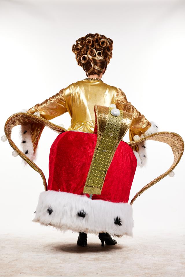 A right royal affair is sure to be had with this showstopper of a dame dress! The Crown is built with a rigid frame and foam all covered with red velvet and white fur Faux Ermine. The body suit is gold stretch fabric with a simple zip up the back and bell sleeves ending with faux ermine trim. The crowns bars are covered in sparkling gold fabric and large faux pearls. A great walk down piece. Wig and boots not included with this hire. Size Universal, U.