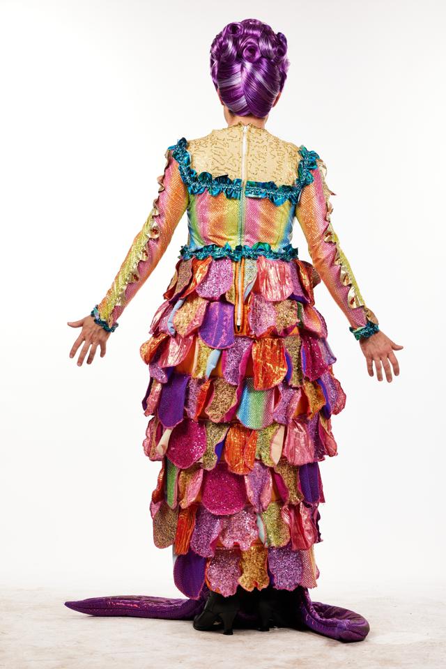 Darling it's better, down where it's wetter, under the sea! The very epitome of a fish tail dress is constructed with many quilted fish scales and tail in marvellous multicolour rising up to a matching bodice adorned with two ornate clam shells over the décolletage. The Rainbow coloured arms are decorated with fabulous little fins all down the seam and the whole thing is held up by two ruffle straps. Zip up the back means this is a great costume for a quick change, Size, S-M, Small-Medium. Boots and Wig not included in this hire.