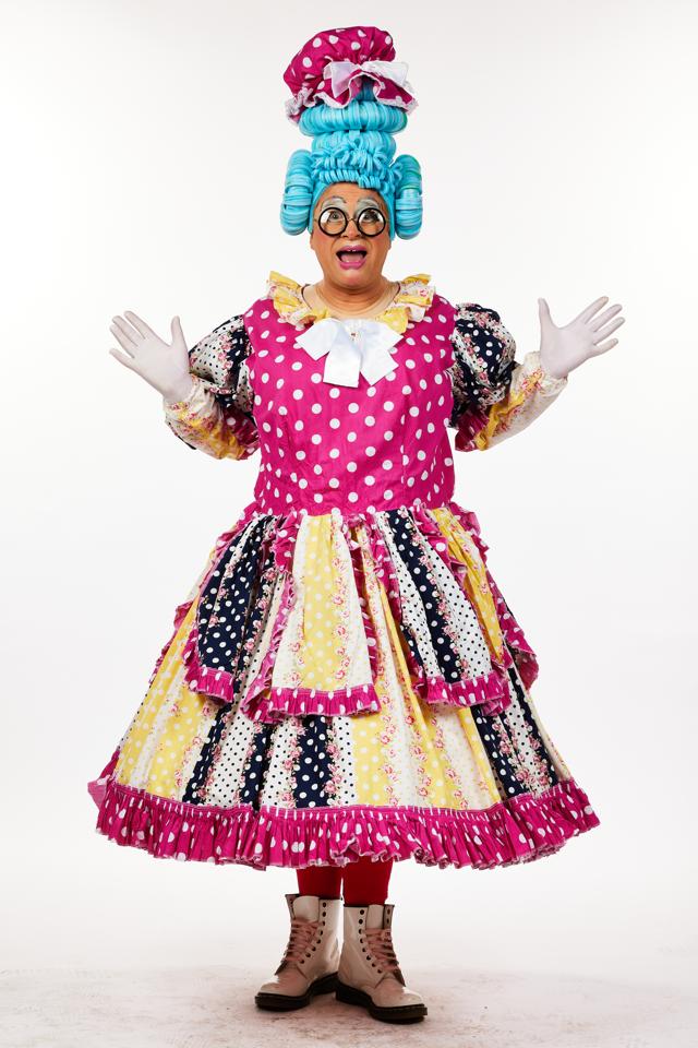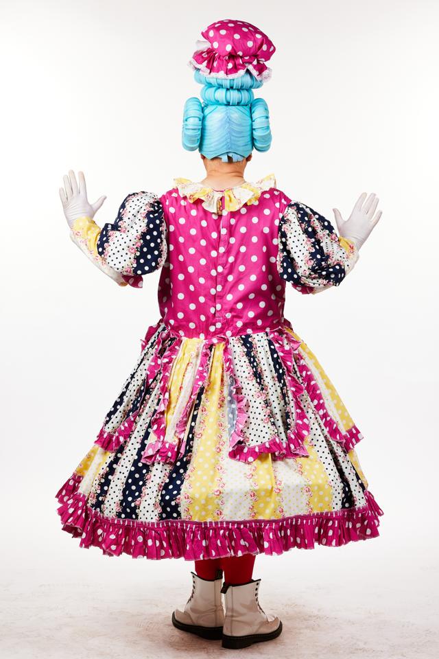 A pink, blue & yellow dame worker. Hoop not included. Wig not included.