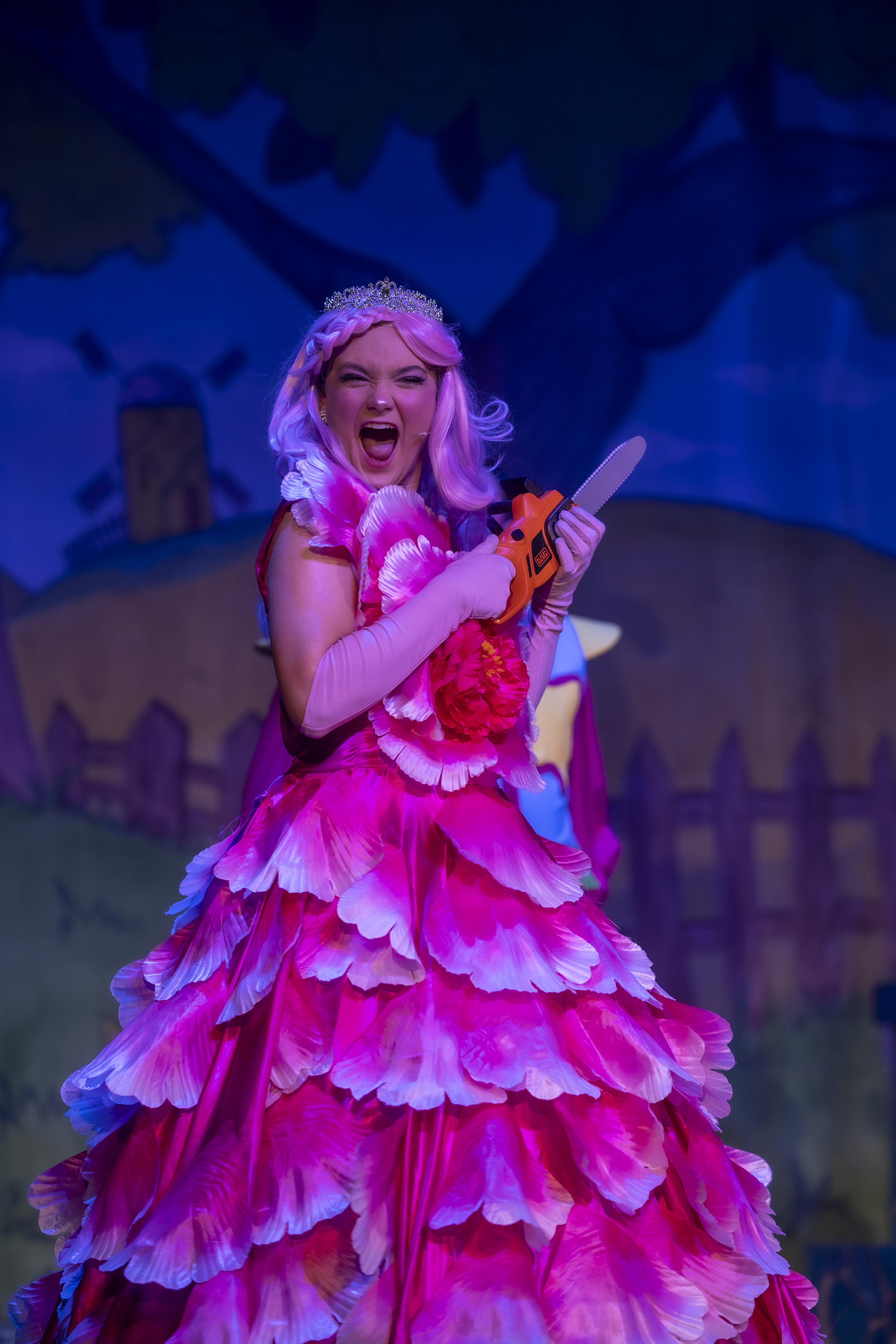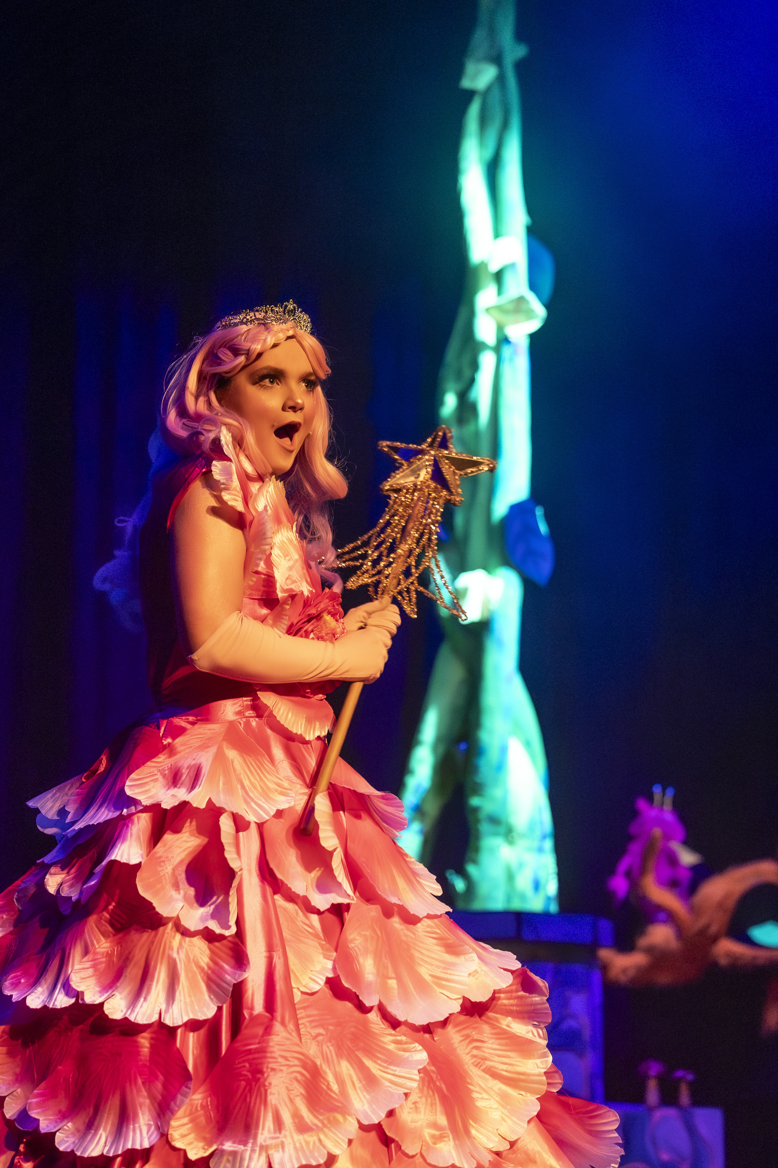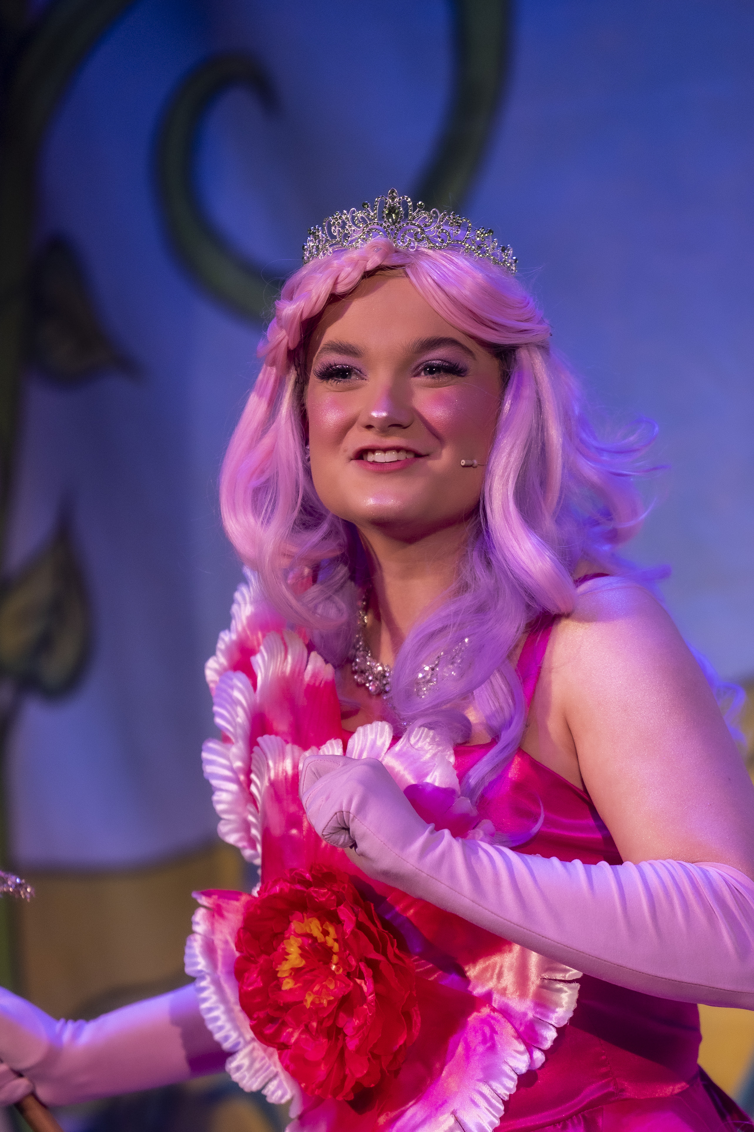 Pink flower petal dress with attached belt bow. Comes with pink gloves. Will fit a ladies size 8-12. Actress in pictures is wearing a hooped underskirt (not provided). Please note that we also have identical versions of this costume in yellow and green - ideal for the 3 Sleeping Beauty fairies or a walkdown version!