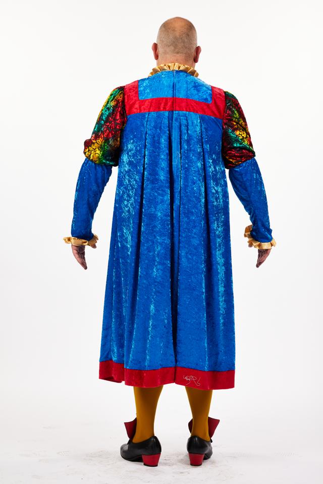 Men's comedic large tunic/robe in bright blue chenille? fabric with two tone sleeves. The tunic has a contrasting red band around the hem and a decorative boxed design around the neckline in red. The sleeves are topped with shiny decorative multi coloured fabric. The collar and cuffs are tripped with ruched gold ribbon. Perfect for alderman/medieval government official, Monk, Villain or Henchman. Used for Alderman in Dick Whittington (Panto). Size XL Chest 50". Shoes not included.